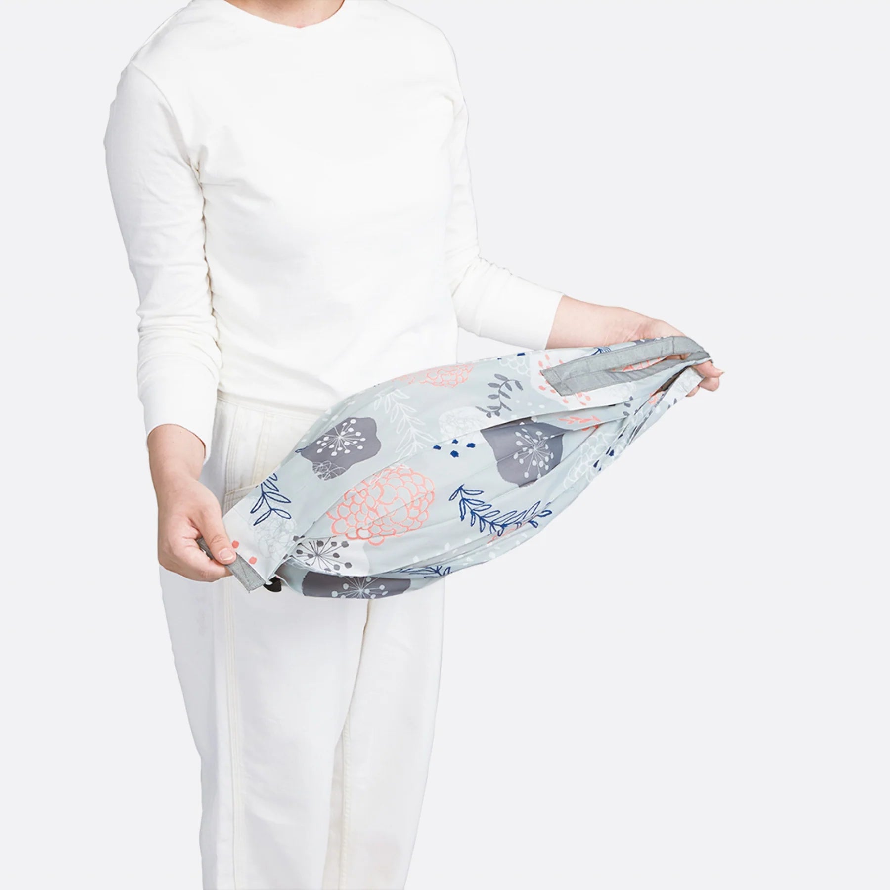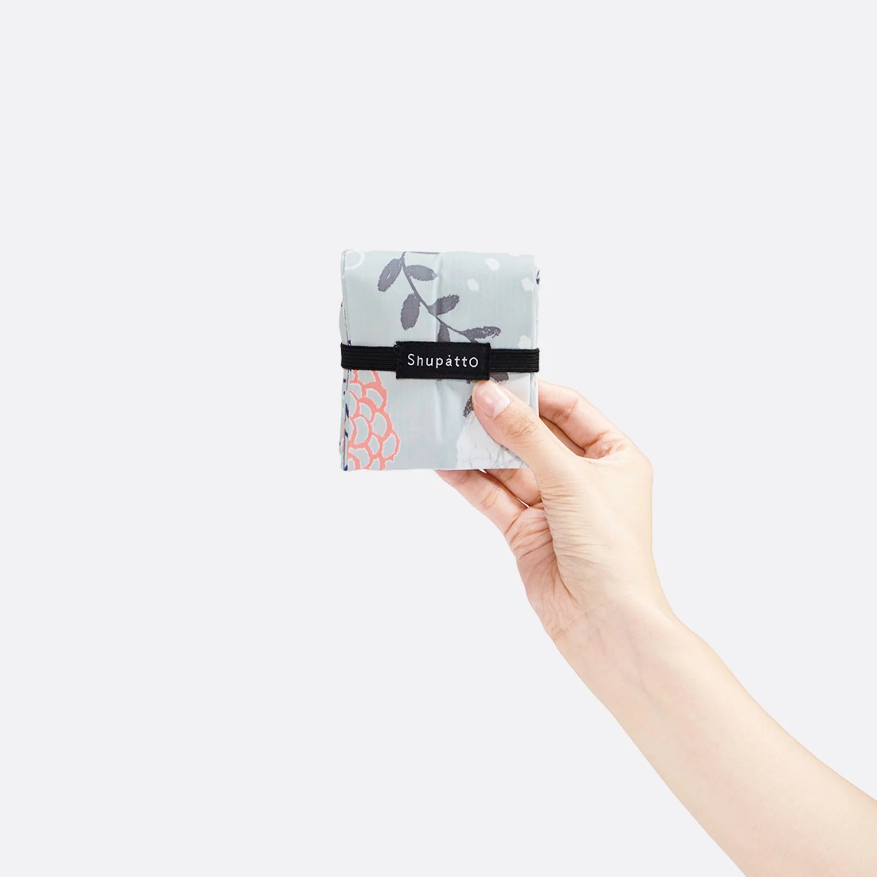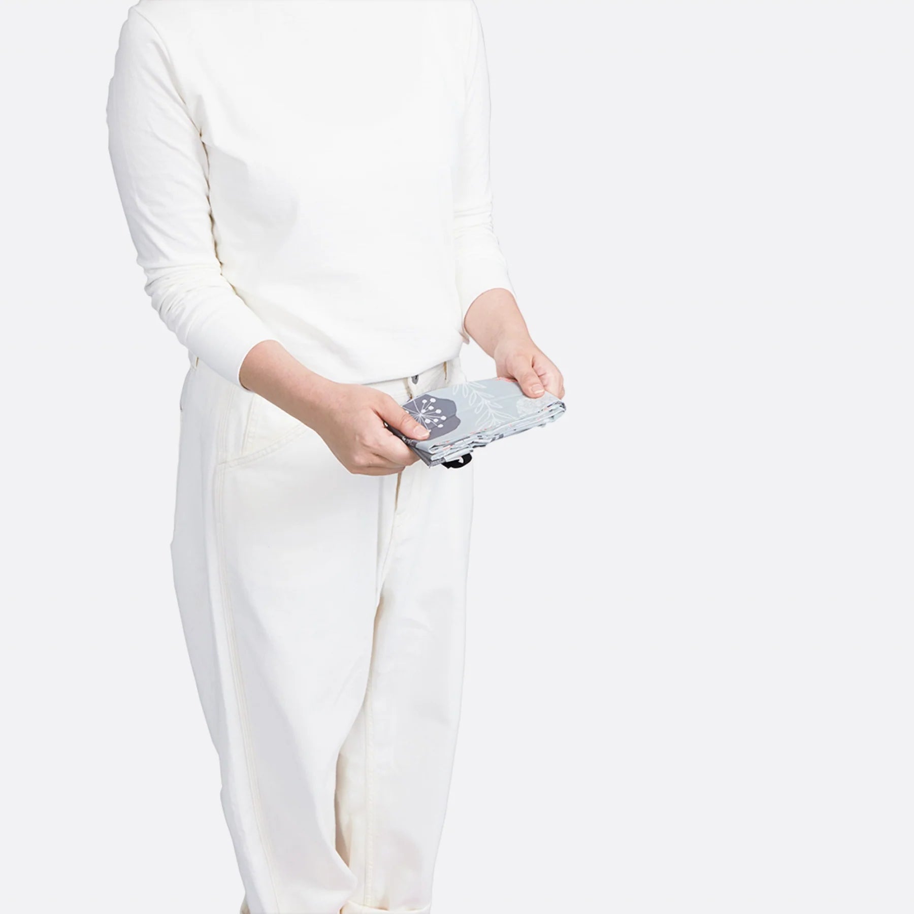 Pull the bottom and handles into a strip — it folds into a compact square about the size of a handkerchief. Tuck it into your main bag and you're ready to go.
