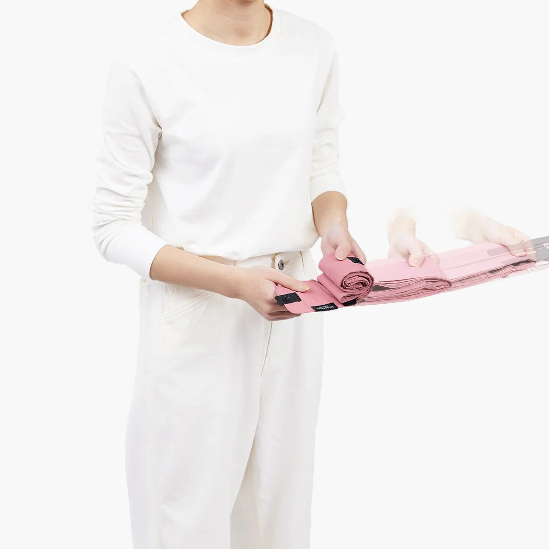 Just pull both ends sideways and roll. It folds into a compact bundle with a smooth, satisfying snap.