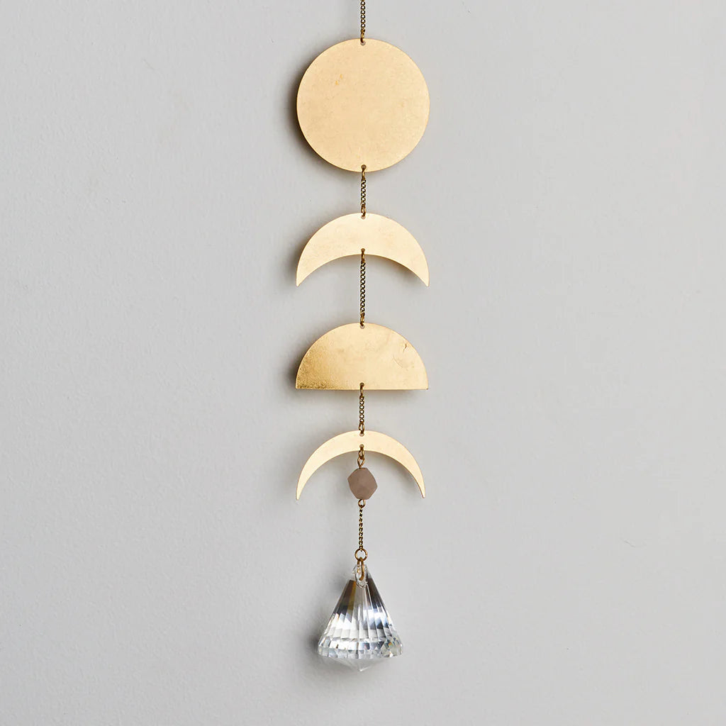 Illuminate your room with this Moon Phase/Moonstone Suncatcher! Experience the enchantment of natural gemstones and brass as they capture the sun's radiance and infuse calming energies. Add a bit of magic and wonder to any space.