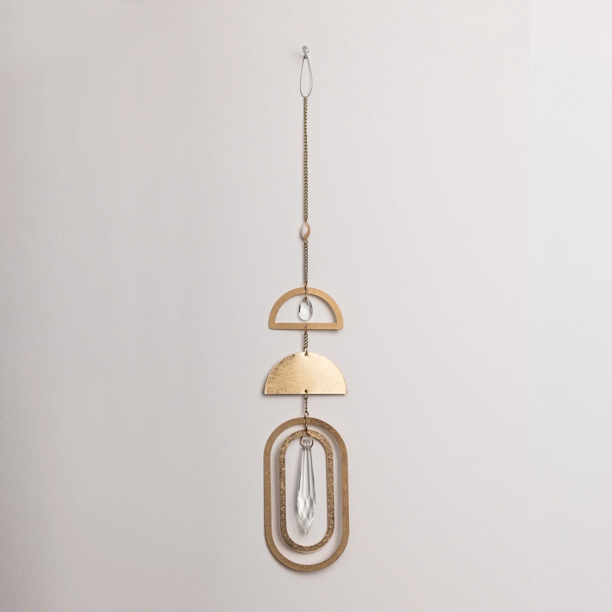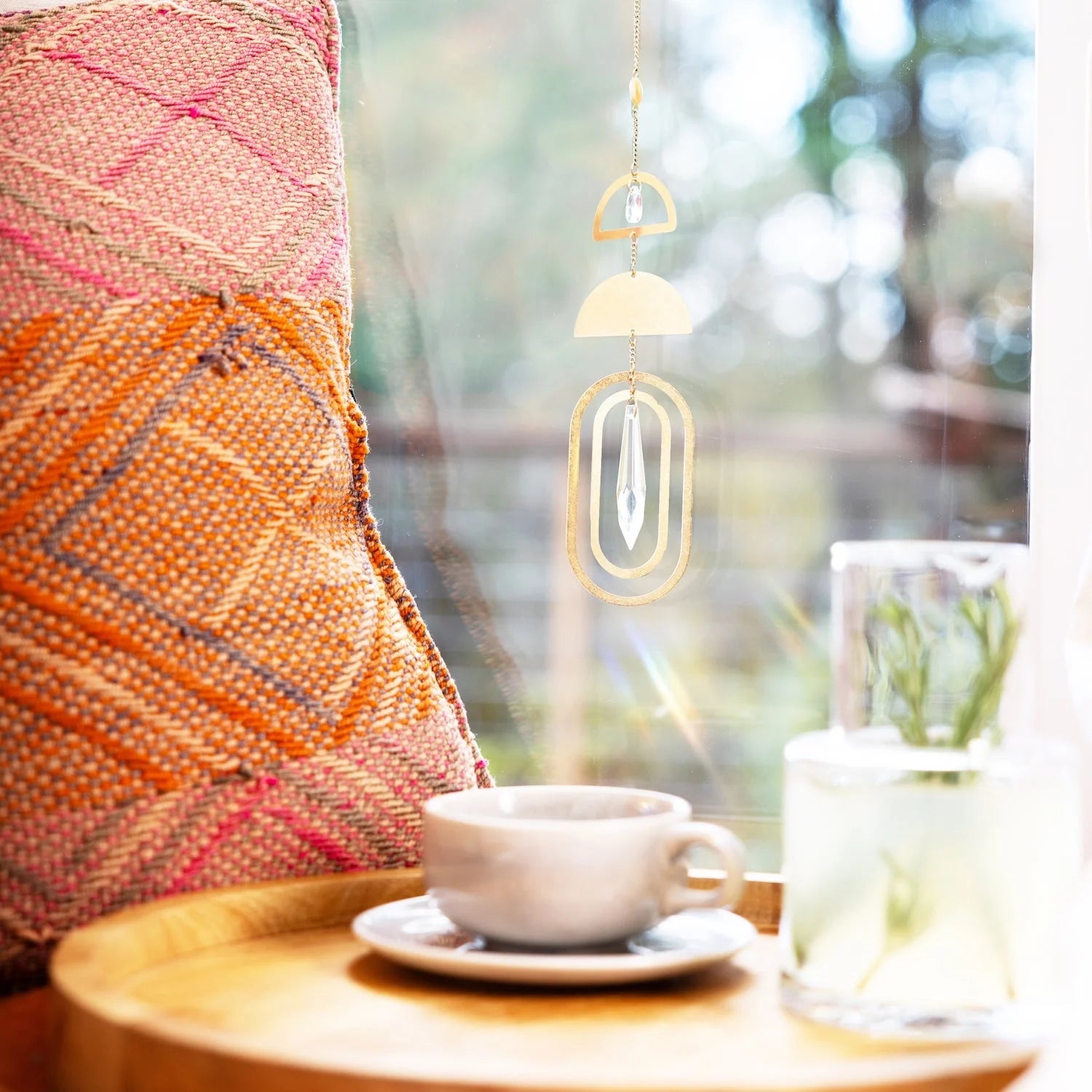 Elevate your space with our Mother of Pearl Crystal Suncatcher, designed to transform sunlight into soft, magical rainbows. Crafted from gold-plated brass, a faceted glass crystal, and Mother of Pearl, this piece brings beauty and intention to any sunny window.